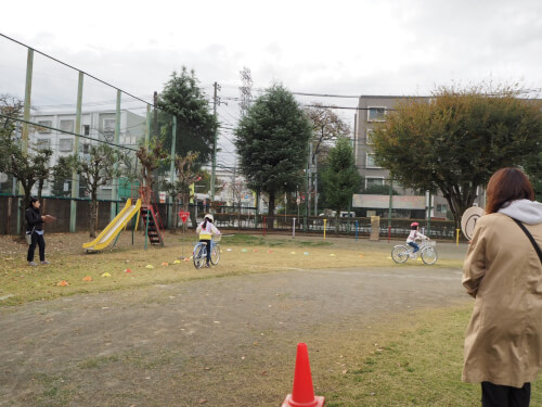子どもたちはまず、グループごとにサポート役の大人と一緒にコースを確認しました。その後、実際に自転車に乗って実践練習を行い、最後にドキドキのテストを受けました。